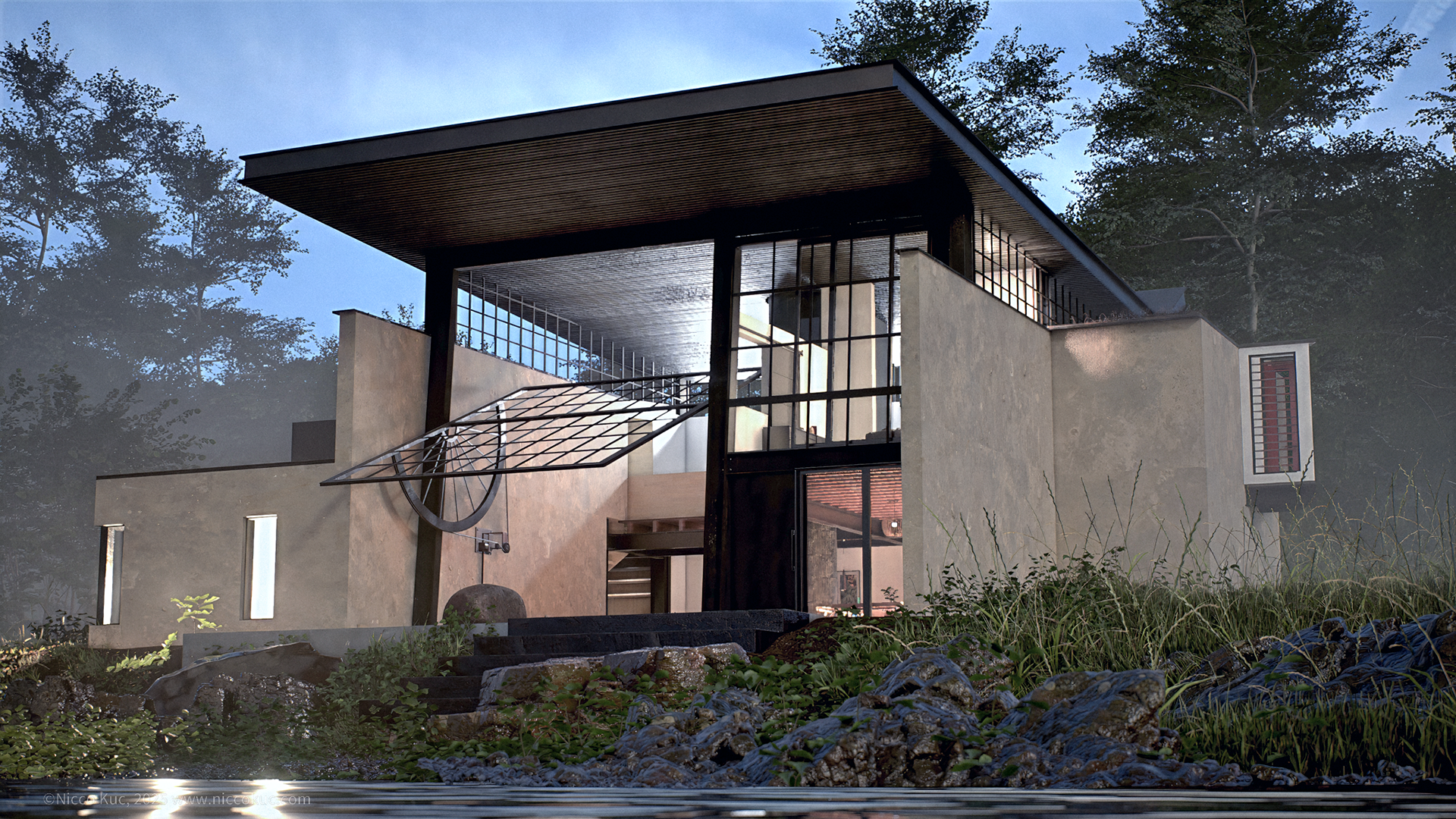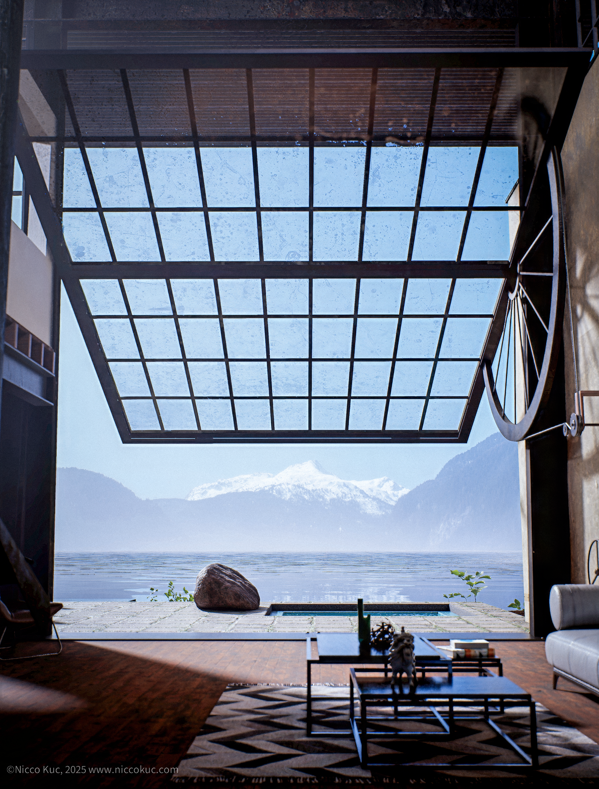 Designed by Olson Kundig Architects, the solution was a bold architectural gesture — a massive operable window wall that opens the entire living space to the lake, activated by an elegant manual hand crank.